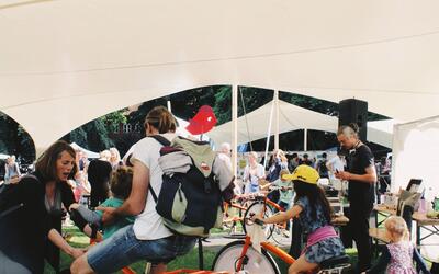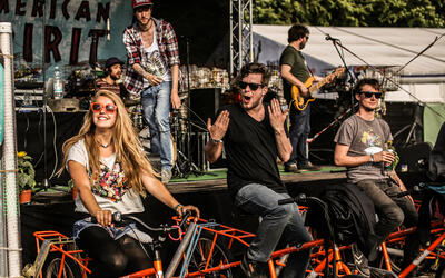 Bei der Fahrraddisko wird auf 5 Fahrrädern gemeinsam die Energie für eine Bühnenbeschallung erzeugt.