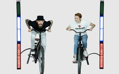 Auf zwei Fahrrädern treten Teilnehmer im Wettstreit um den erzeugten Energie-Peak an. Spaß und Action garantiert!